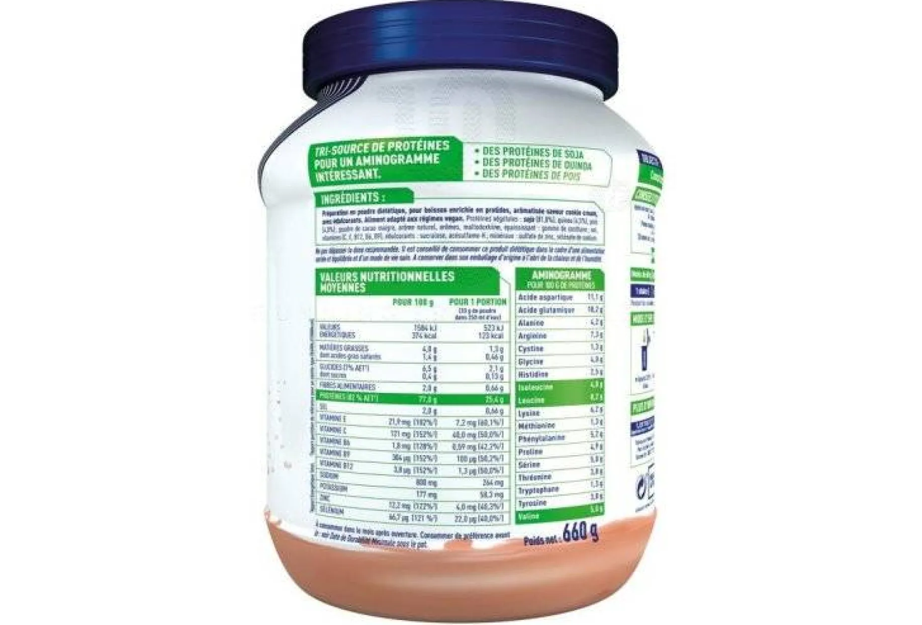 - Protéines végétales (soja, quinoa et pois) : acides aminés