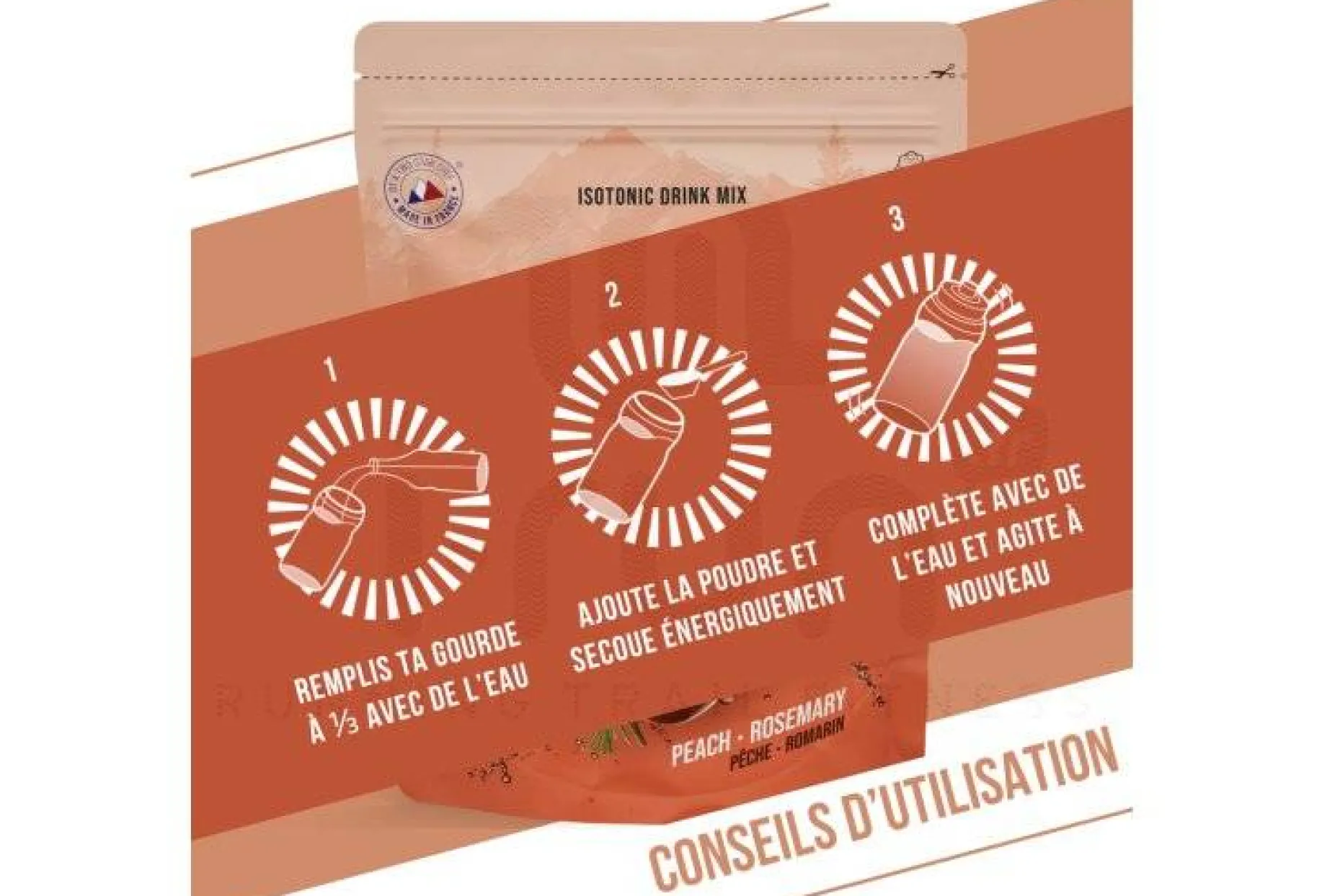 Maltodextrine de manioc, sucre de canne, dextrose, BCAA : L-Leucine, L-Valine, L-Isoleucine (dont émulsifiant : lécithine de tournesol) ; sel de Guérande, citrate de potassium, citrate de magnésium marin, citrate de calcium, arôme naturel de pêche, extrait d’acérola, arôme naturel de romarin, arôme naturel d’abricot, L-Glutamine, taurine, bisglycinate de zinc, vitamine E, B3, B1, B6, B2.