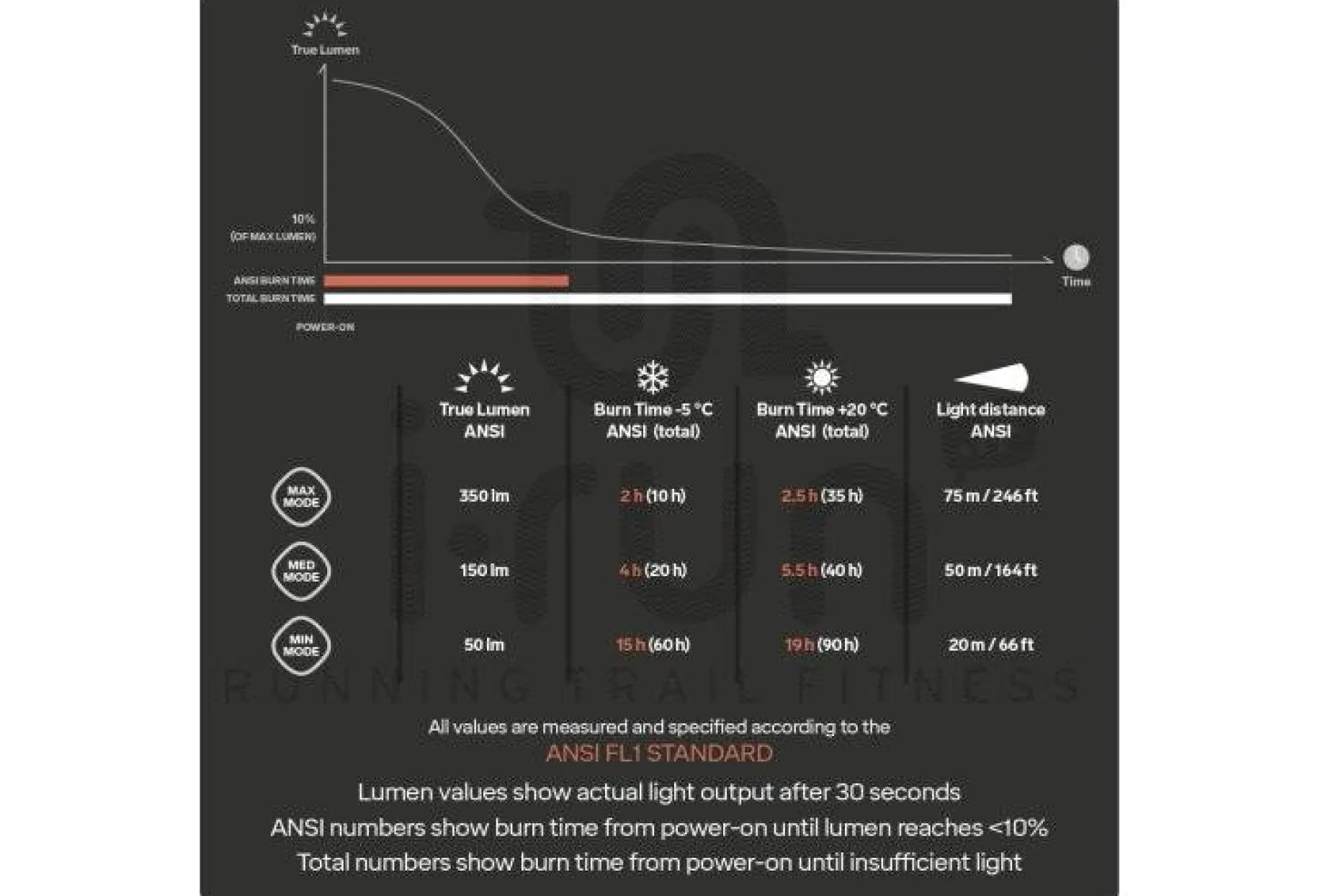 - Lumens : 50 (mode min), 150 (mode med) et 350 (mode max)